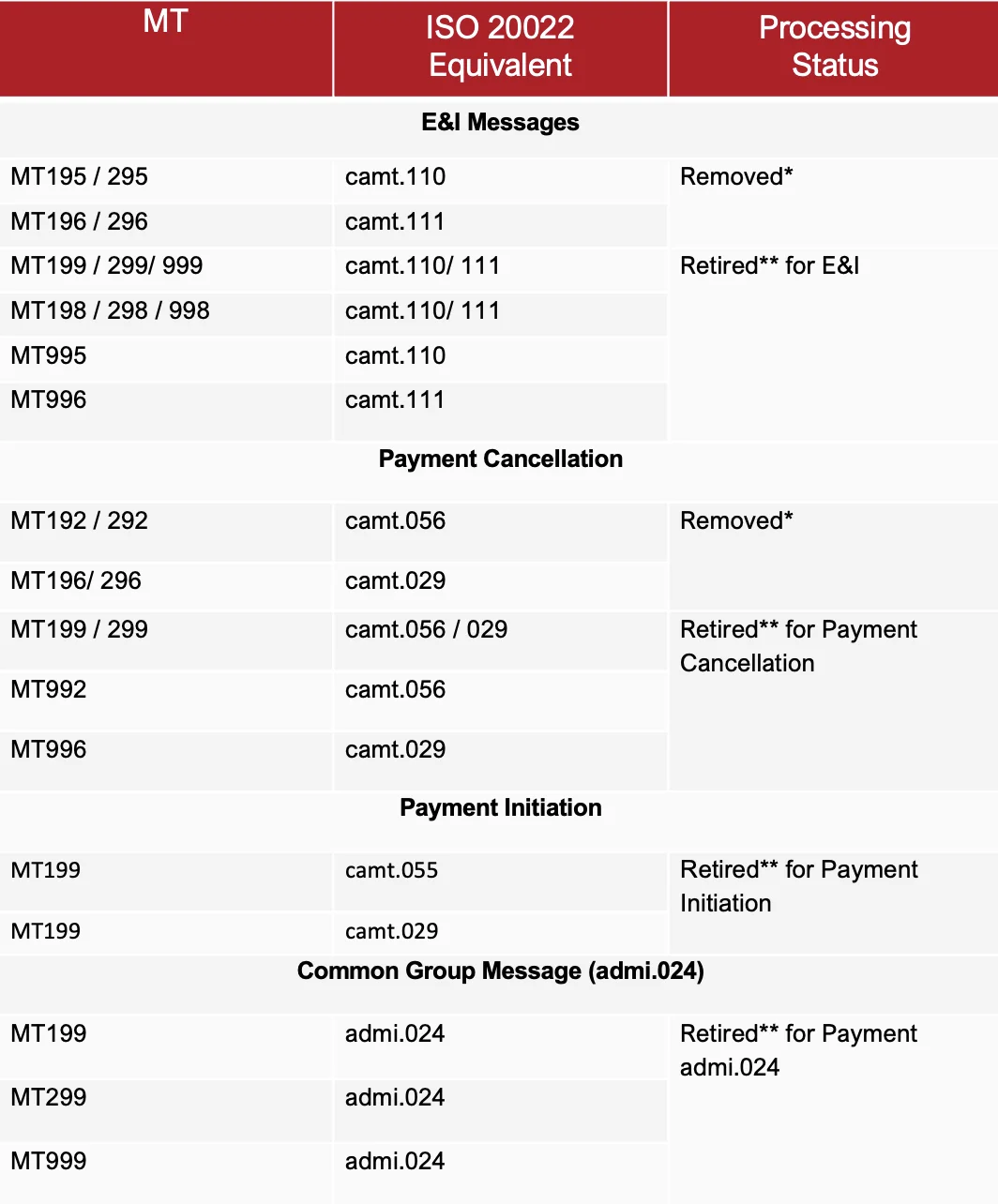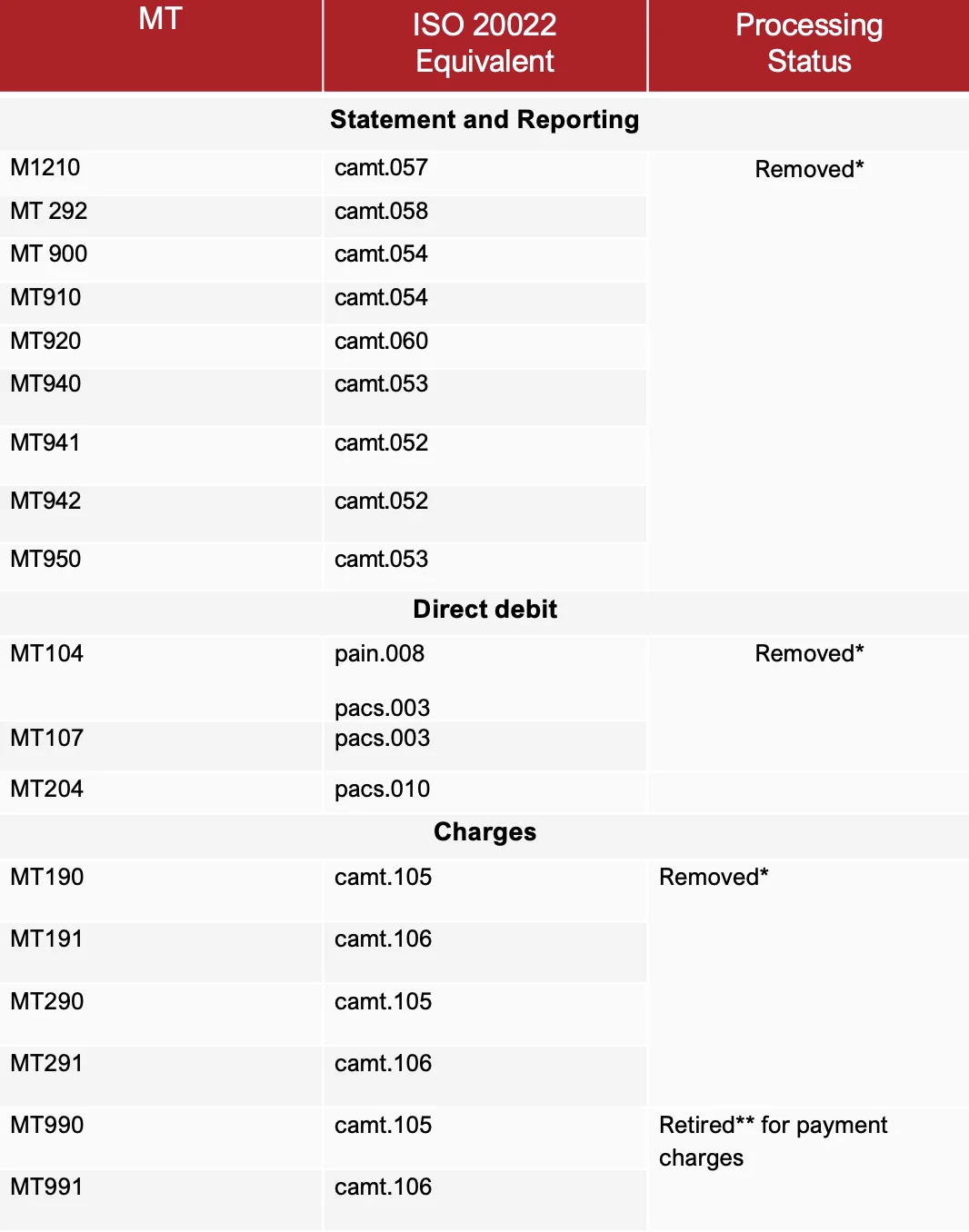 Direct debit messages such as MT104, MT107 and MT204 are also being retired in favor of ISO messages like pain.008, pacs.003 and pacs.010.