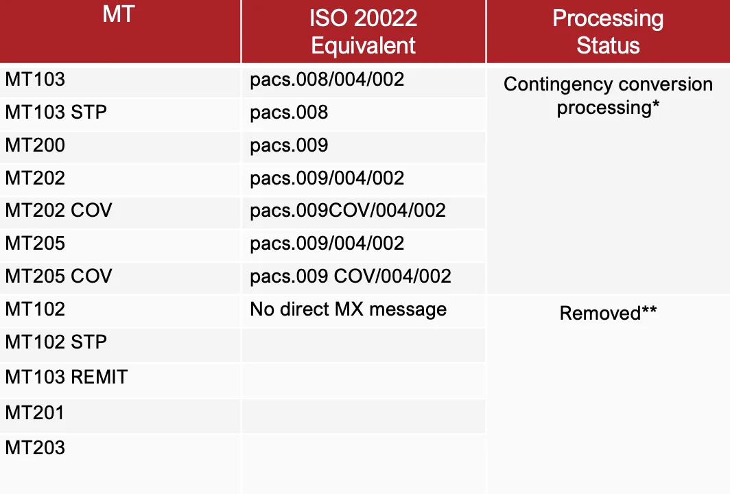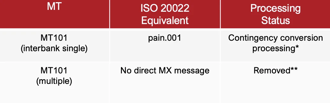 Removed**: Messages are not eligible for Swift’s MT→MX contingency conversion and will be immediately rejected with a negative acknowledgement (NAK).